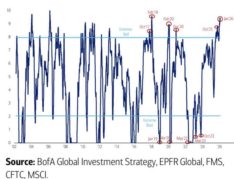 • Muy alto (por encima de 8): sentimiento extremadamente alcista → señal teórica de venta. BofA lo interpreta como optimismo extremo y una señal de que el mercado podría estar próximo a un retroceso o corrección.