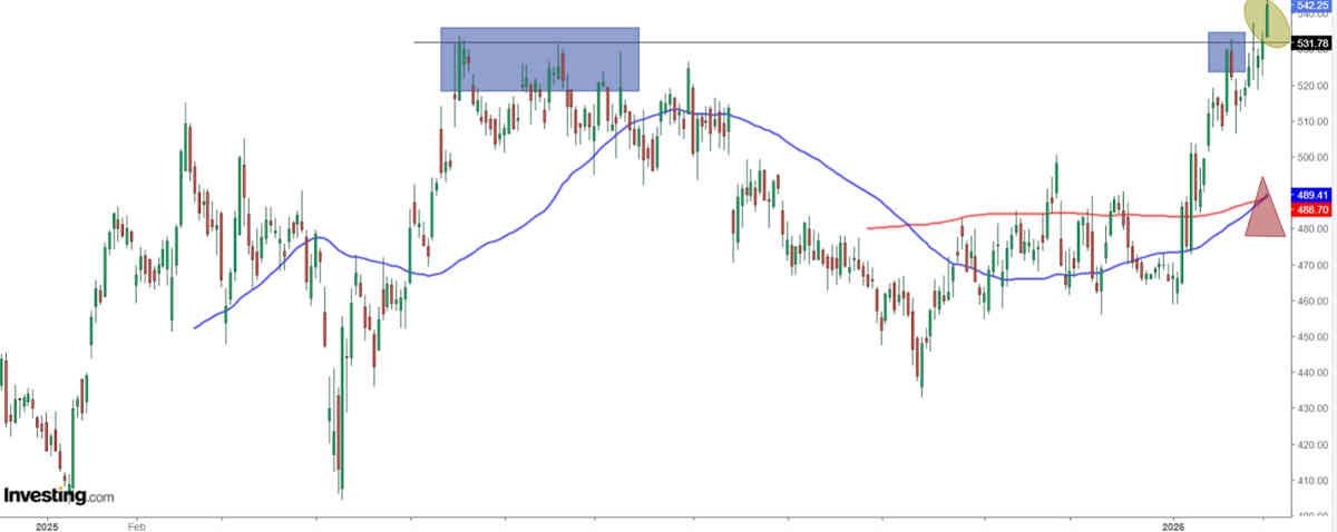 – Deere ha formado el patrón cruz dorada que consiste en que la media móvil de 50 días cruza al alza la media móvil de 200 días. La última vez que sucedió fue en octubre de 2024 y las acciones subieron un 32% los siguientes 7 meses.