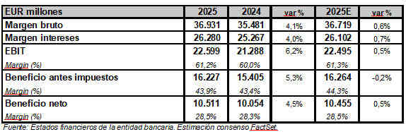 +0,5%; consenso FactSet), hasta los EUR 22.599 millones. En términos sobre margen bruto, el margen EBIT cerró 2025 en el 61,2% (vs 60,0%; 2024; 61,3%; consenso analistas).