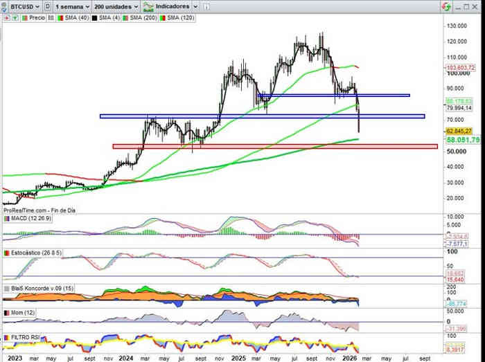 Sobre Gráfico Semanal, tras romper con fuerza los soportes superiores, ahora resistencias, yo no haría nada mientras no apoye en la zona de la importante Media Móvil 200 ahora por 58.500$ y más bajo en barridas confirmativas en la zona soporte rango por los 54.500$ / 52.000$ y en el defecto de este movimiento correctivo mayor, por arriba no la tocaría por lo menos hasta que la veas perforando la zona de los 71.500$ / 74.000$.