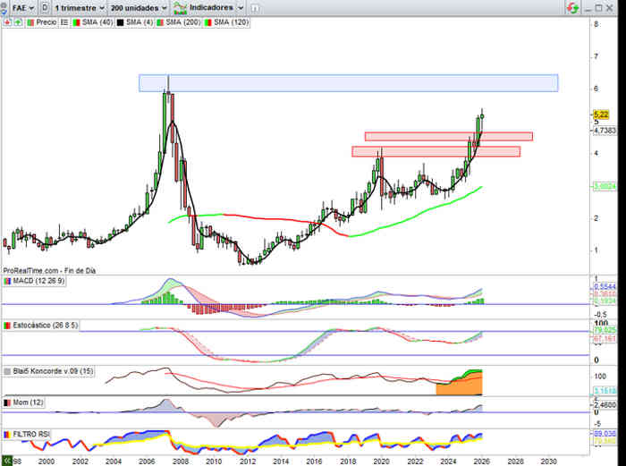 Una vez asentada sobre los 5 euros, los expertos técnicos confían en una nueva fase alcista a corto y medio plazo, máximo si consigue confirmar las previsiones positivas, en especial, en ventas.
