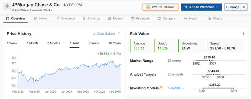 - JPMorgan Chase: Implica un potencial alcista del 14,6% en el valor razonable, gracias a la resistencia de las operaciones bancarias y a los vientos favorables de los tipos de interés.