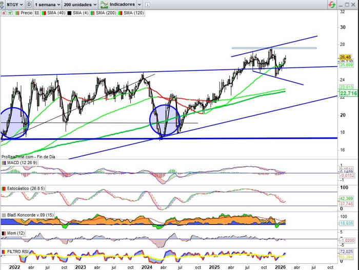 Sobre Gráfico Mensual, empieza el mes por tanto con los recortes oportunidad de mercado de momento con todas las credenciales técnico y fundamentales del lado alcista, indicadores en señal compra y en favor de tendencia y estamos ante prueba posiblemente definitiva de un tiempo de respiro para posiciones cortas mientras el valor no reactive el Plan Recompra de Acciones, de momento en Patrón 3 Soldados Blancos confirmado a cierre Mes de Diciembre del 2025, estos dos primeros meses gestionando resistencias clave mientras se mantiene en lateral de consolidación de la subida protagonizada hasta ahora desde la zona de los 6€ por acción.