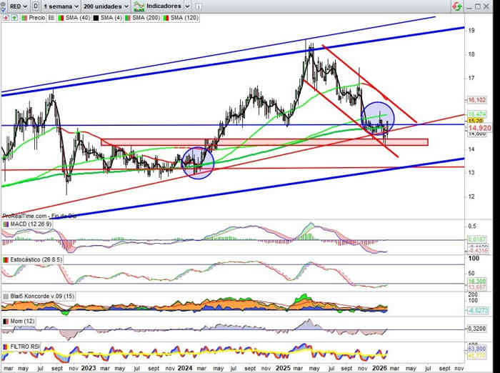 Interesante en los deberes del valor para estas próximas semanas empezar a reflejar cierres por encima de los 15€ para disponerse a probar el techo del canal bajista, a confirmar llegado el momento por tanto en su perforación como el fin de su fase consolidativa. Punto de Inflexión Alcista en los indicadores. Compras muy interesantes en el valor esta semana.