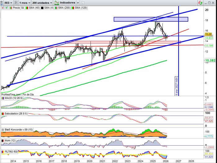 Objetivo por tanto del relanzamiento alcista hacia los máximos históricos en los 18,62€, pero en rango hasta la zona de los 17,82€ desde el que el valor en cierres mensuales ya implicaría proyección a nuevos máximos históricos. Indicadores en señal de compra, ahora falta se incorporen a la tendencia, alcista de fondo.