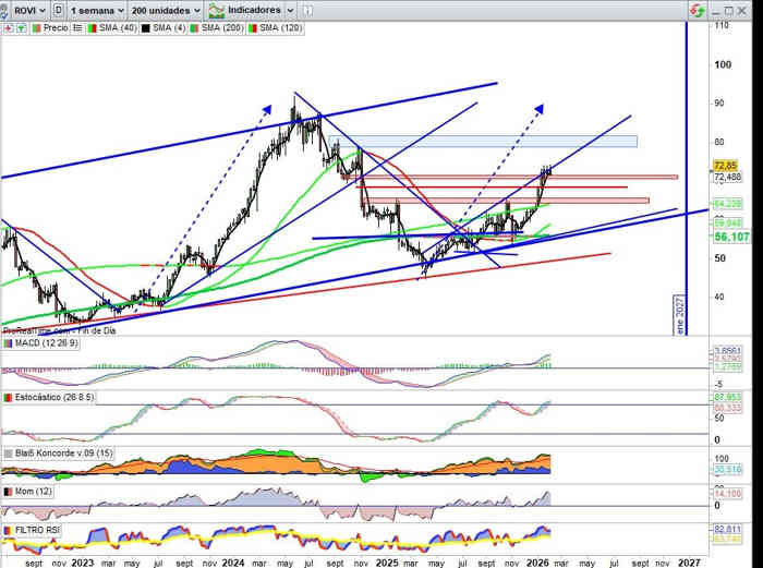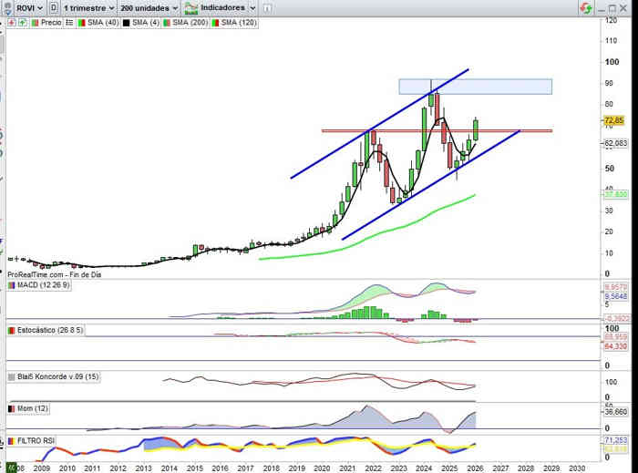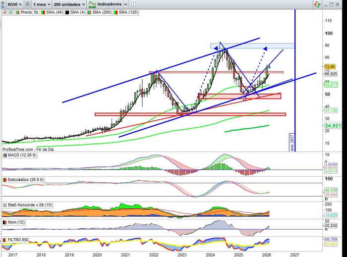 El soporte aquí de proyección de la estructura, en la zona en el rango entre los 69€ y 68€ clave a respetar en cierres mensuales si hay una cambio significativo en la volatilidad, por el motivo que sea. Indicadores en señal de compra y en favor de la tendencia, en actual estructura, la referencia del MACD que comentaba en anteriores actualizaciones sobre otros activos, de alto potencial alcista.
