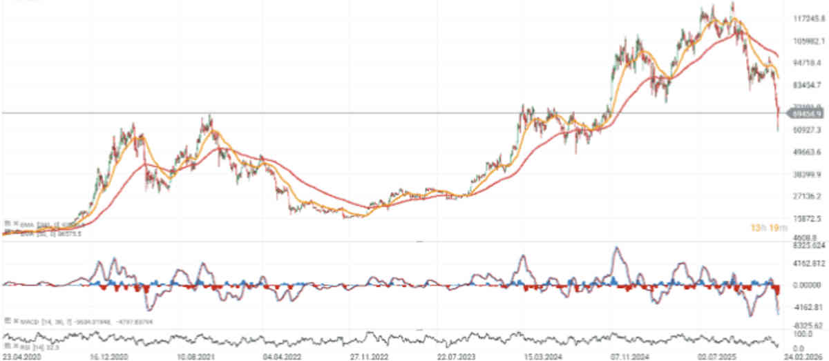 El Bitcoin cotiza aproximadamente 43% por debajo del máximo de octubre, y en el marco diario —pese al rebote del viernes— sigue con un RSI cercano a niveles de sobreventa.