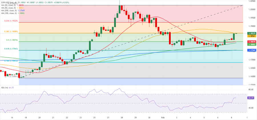 En el gráfico de 4 horas, el EURUSD cotiza a 1.1858. La media móvil simple (SMA) de 20 períodos ha girado al alza pero sigue por debajo de la SMA de 50 períodos, que tiene una ligera pendiente a la baja. Las SMAs de 100 y 200 períodos tienden al alza, lo que sugiere una tendencia más firme a medio plazo. El RSI de 14 períodos en 61.8 se eleva por encima de la línea media, subrayando la acumulación de impulso alcista.