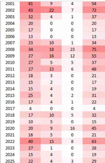 Miren, si cogemos el SP500 desde el año 1928 y observamos las caídas de un 1%, 2% y 3% o más, podemos ver que casi en el 30% de todo ese periodo, hubo un total de más de 40 caídas. Por ejemplo, desde 2001, , los últimos 25 años:
