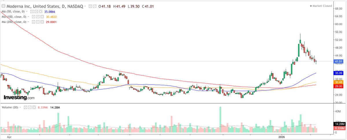 El precio de Moderna ha perdido fuerza tras una fuerte subida reciente, cerrando el viernes en 41,01 dólares. Aun así ha subido un 67,1% en tres meses y un 21,1% en el último mes, pero la caída del 7% de la semana pasada sugiere un debilitamiento del impulso.