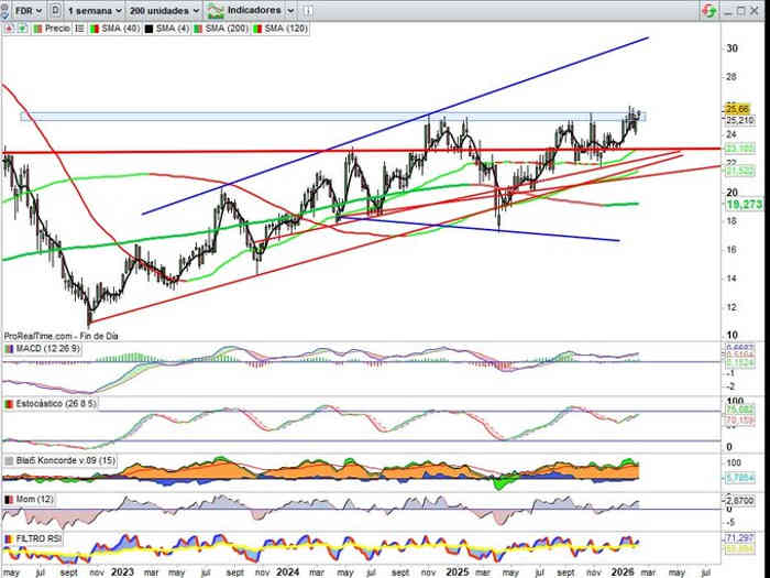 De momento a lo largo de la semana +1,99%, esta reflejado a lo largo del fin de semana en las diferentes temporalidades, pero vamos a actualizarlo a la interesante situación del cierre de hoy de momento porque se ve en perforación de la resistencia clave, bien sabido es que necesitamos confirmación en cierre semanal, y sobre esta vista en Semanal, de momento cuerpo de vela cruzando la referencia en rango 25€ / 25,60€, el cierre de hoy me ha parecido en subasta como el cierre de ayer de Solaria, la han como tirado un poco como para no visualizarlo en toda su amplitud, por encima de 25,70€, sería mas determinante, vamos a ver si mañana hace por tanto lo que SOLARIA ha hecho hoy tras el robo en la subasta de ayer.