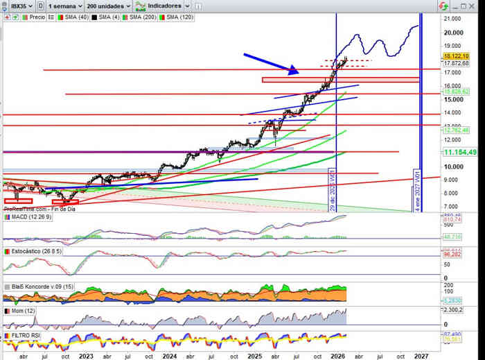 Sobre Gráfico Trimestral, que es la que nos aporta la mayor señal compra sobre el principal índice de referencia de mercados españoles, de momento con un +4,70% de revalorización en lo que llevamos de Trimestre, todo en orden técnico para ir confirmando mejora de soporte al alza y por tanto referencia de proyección o continuidad alcista sobre el escenario ya planteado de la tendencia Alcista / Lateral / Alcista estructural activada desde finales del 2025 al descartar ese Doble Techo, lo que deja al principal índice de referencia de mercados españoles preparado para buenos años inversores.