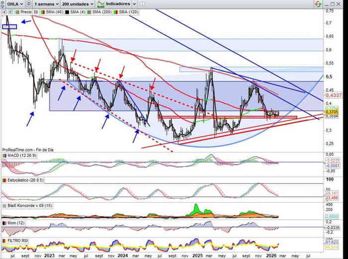 Recordar el Gráfico Mensual, de alto potencial alcista ahora nuevamente que nos ha dado regreso al valor tras ejecutar beneficios sobre objetivos anteriores, +3,20% de momento este mes, pero la clave la tendencia, desde la directriz soporte parece preparada para empezar a atacar las directrices bajistas comentadas, por ahora entre 0,42€ y 0,50€. Y los indicadores preparándose de manera correcta pese a la volatilidad del valor, de momento y de un tiempo a esta parte, en favor de la tendencia alcista. de medio plazo intentando imponerse a la bajista de largo plazo. En corto plazo por tanto parece dispuesta a iniciar un nuevo impulso.