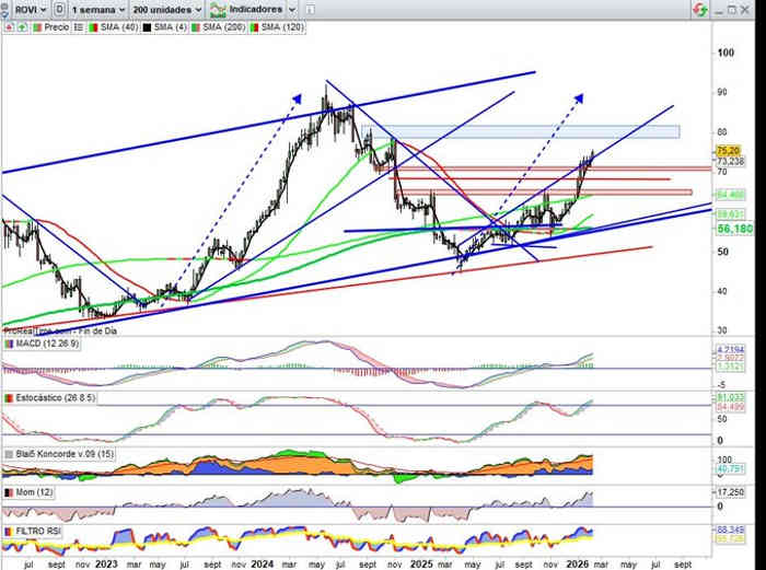 Activo perforando resistencia del campo Expansivo, la directriz alcista me gustaría que la siguiese en menor verticalidad como resistencia, pero esto no va de gustos, sino de realidades, y de cara a cierre semanal vigilamos si quiere hacerlo siguiéndolo como soporte hacia la zona resistencia media de los 79€ / 82€, o si la verticalidad sigue demostrando la fortaleza compradora y enorme interés que hay sobre este activo en este momento de mercado. Indicadores en señal compra y en favor de la tendencia, en actuales credenciales lo tiene todo para ver esa zona resistencia inmediata si confirma por tanto la perforación de la directriz del Campo Expansivo.