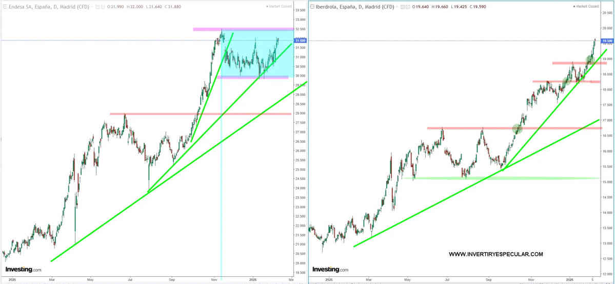 Mejor un gráfico que una parrafada desde noviembre Endesa (ELE:MC) echó el ancla en el rango 30-32.5 euros mientras el IBEX ha ido haciendo máximos históricos uno tras otro hasta superar ya los 18000 puntos.