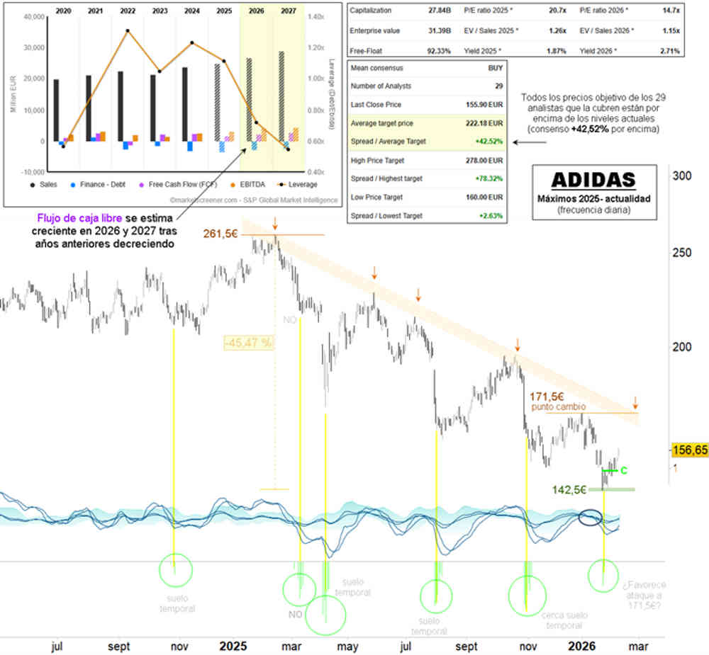 Adidas acumula un 45% de caída desde los máximos del año pasado, generando síntomas positivos en el corto plazo, que, a priori, favorecen un ataque a los máximos del pasado diciembre, en 171,5 euros, nivel que conforma el punto clave de cambio de la tendencia bajista previa.