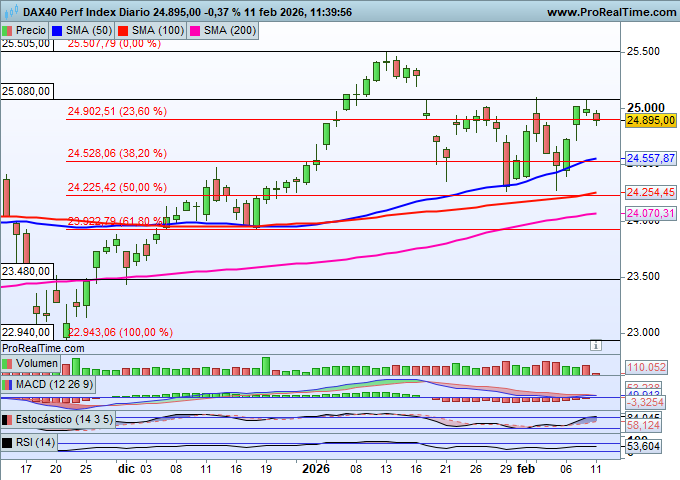 Los índices europeos también muestran ciertas dudas, ya que algunos, como el DAX alemán, se acercan a zonas de referencia clave en términos de resistencia psicológica, situadas en los 25.000 puntos. La proximidad a este nivel está dificultando que el DAX continúe su avance y que intente alcanzar los máximos del pasado mes de enero, unos 500 puntos más arriba.