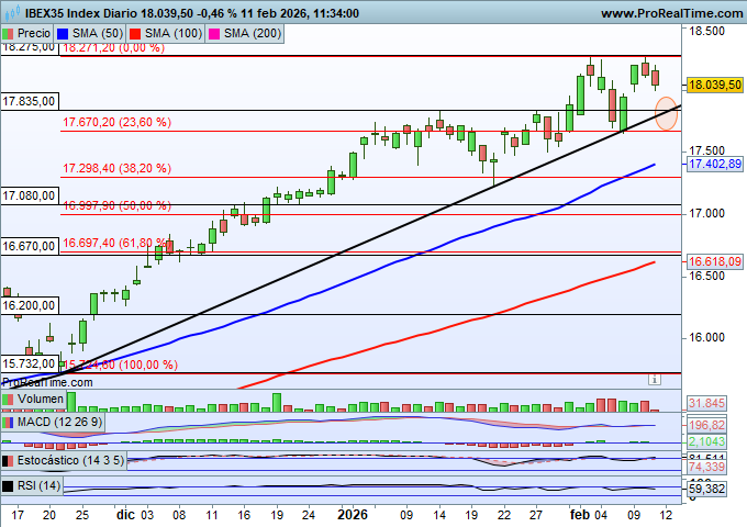 El IBEX35 muestra signos de agotamiento alcista frente a la zona de máximos intradiarios alcanzados el pasado 3 de febrero en los 18.271 puntos. El IBEX35 también intentó acercarse y superarlos, pero no contó con los catalizadores necesarios para lograrlo.