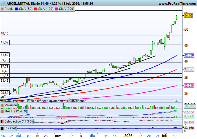 El impulso alcista se ha acelerado tras superar los 42 euros por acción, lo que ha permitido a ArcelorMittal avanzar de forma consistente. A pesar de que los niveles de sobrecompra son elevados, no se aprecia agotamiento en la subida.
