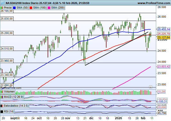 En cuanto al tecnológico Nasdaq 100, este índice se ha quedado rezagado, ya que los recientes avances en inteligencia artificial impulsaron una burbuja tecnológica que finalmente ha estallado, llevando al Nasdaq 100 por debajo de su directriz alcista situada en torno a los 25.300 puntos.