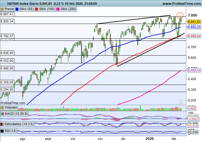 En cuanto al SP500, el índice se mantiene frente a la zona psicológica de los 7.000 puntos, que actúa como una resistencia significativa a la que se enfrenta nuevamente. Tras un intento fallido de superación a finales de enero y la posterior caída hacia los 6.780 puntos, el índice vuelve a intentarlo, superando con fuerza y determinación la media móvil de 50 periodos.
