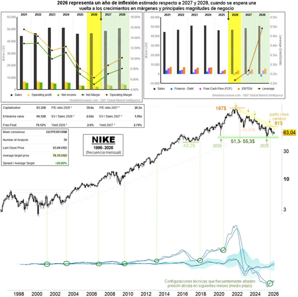 Desde los máximos históricos de noviembre 2021 hasta abril del año pasado, la cotización de Nike ha caído un 69%, confirmando en los mínimos de 2020 un nivel clave de soporte entre 51,3 y 55,3 dólares.