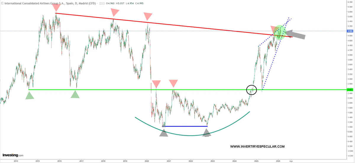 Tras el análisis fundamental de la compañía del emisor del informe y el laxo objetivo de entre el 13%-16% de recorrido alcista tampoco es para meterla en cartera, lo importante para nosotros es que técnicamente está perforando la bajista principal la que viene de los máximos históricos de hace una década que la lleva a conseguir niveles precovid, cosa que para otras aerolíneas de bandera es ciencia ficción, 178% tendría que subir AIR FRANCE para igualarse con IAG ahora bien proporcionalmente Lufhansa está a su misma altura pero claro la alemana está a un 242% de sus máximos históricos, IAG a solo a un 16%.