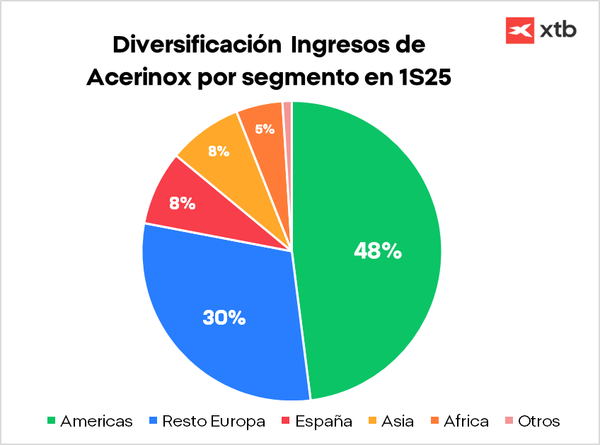 El grado en que cada una se ve afectada depende directamente de su exposición al mercado americano. Si analizamos el porcentaje de ingresos procedentes de esta región, observamos que Acerinox tiene un peso significativamente mayor, lo que implica que cualquier deterioro de márgenes en Estados Unidos impacta más en su cuenta de resultados.