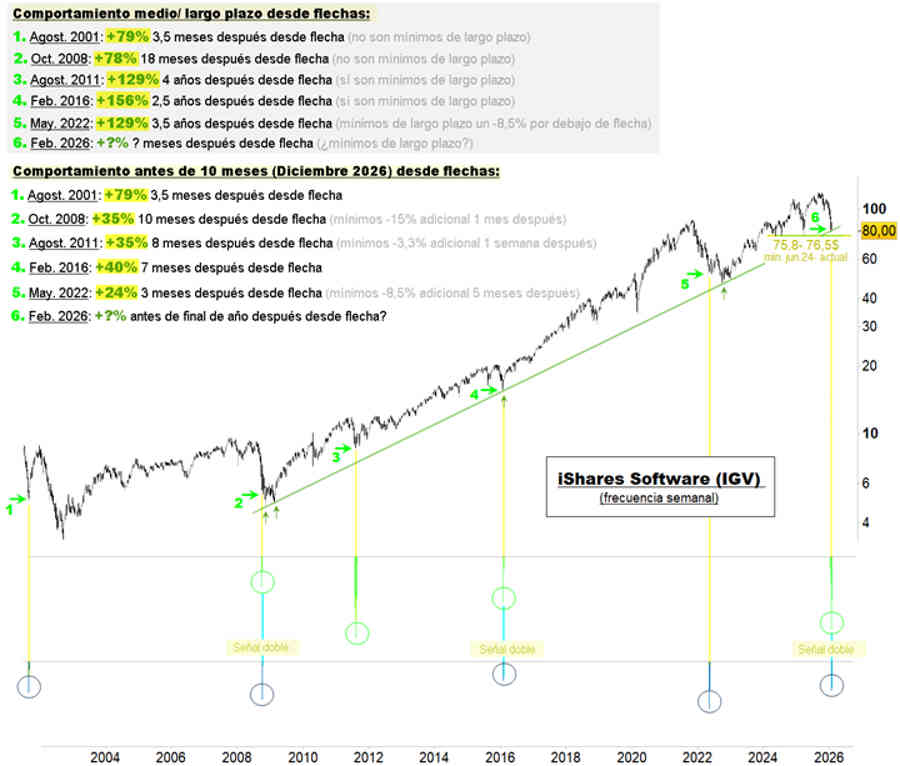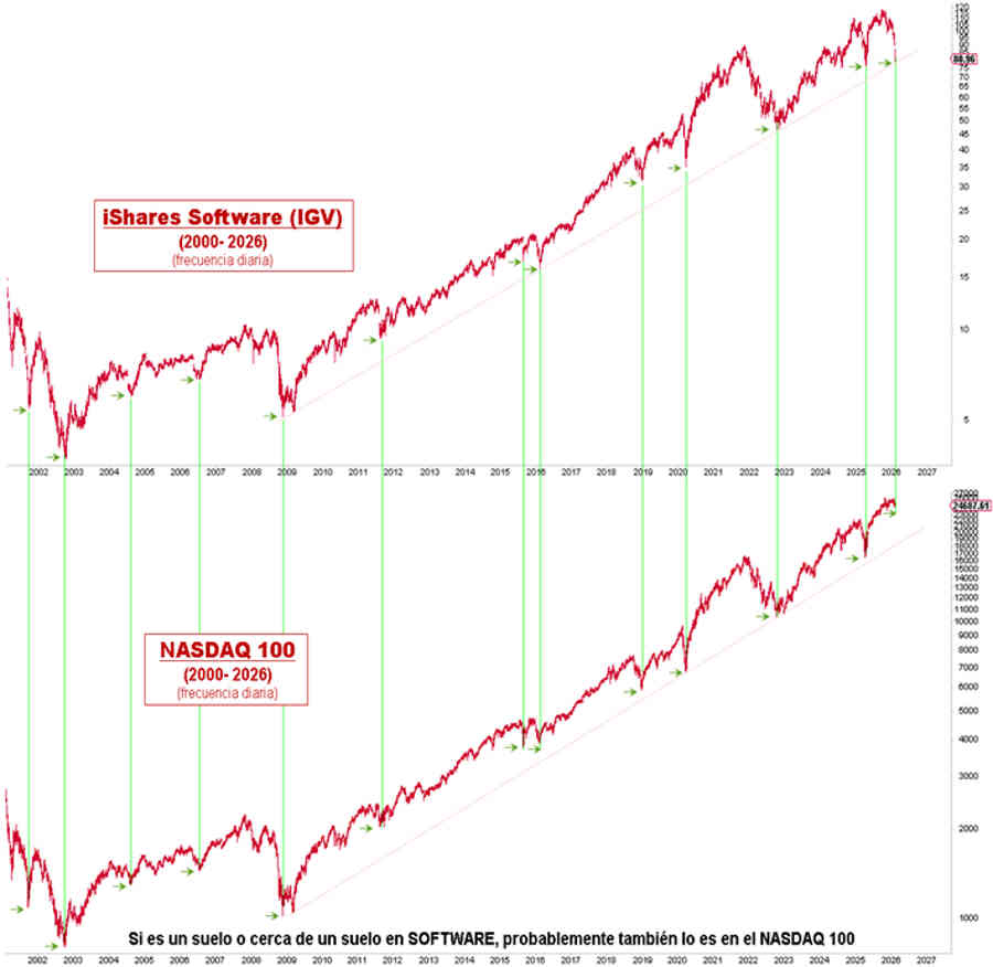La caída del sector software americano nos está ofreciendo una preciosa pista sobre el probable rumbo de los mercados en los próximos meses. La caída del 33% desde los máximos de octubre presenta parámetros excedidos asociados a importantes suelos o a la cercanía de estos.