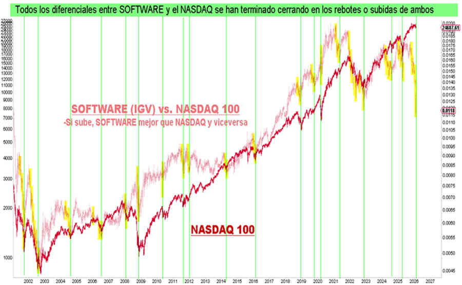 Todo diferencial de peor comportamiento entre el Software y el Nasdaq 100 ha sido cerrado con rebotes o subidas de ambos, nunca con caminos separados, lo que viene a corroborar la tesis de que si estamos ante niveles de compra atractivos antes de 10 meses en el sector Software, no deberíamos temer caídas relevantes en el NASDAQ, al contrario, un buen tono hasta que un rebote de cierta importancia acontezca en el sector Software.