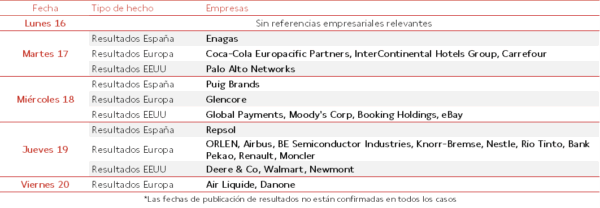 En el ámbito empresarial, destacará la publicación de resultados de Repsol, Enagas, Coca-Cola Europacific Partners, Airbus, Carrefour, Renault, Puig Brands, Nestle, Danone y Rio Tinto, entre otros.