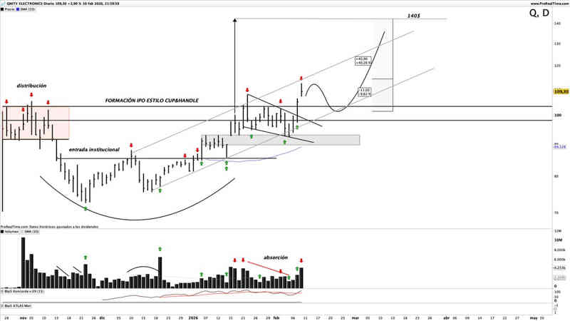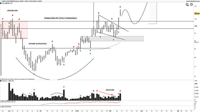 El principal motivo por el que he seleccionado el valor ha sido su fuerza relativa estas semanas, habiendo ruido en el mercado, Qnity es capaz de mostrar solidez y fortaleza, dejando una estructura potencialmente alcista y un volumen que muestra absorción de la oferta. No están distribuyendo, estan re-acumulando, y con los índices en problemas, es una señal a tener muy en cuenta.