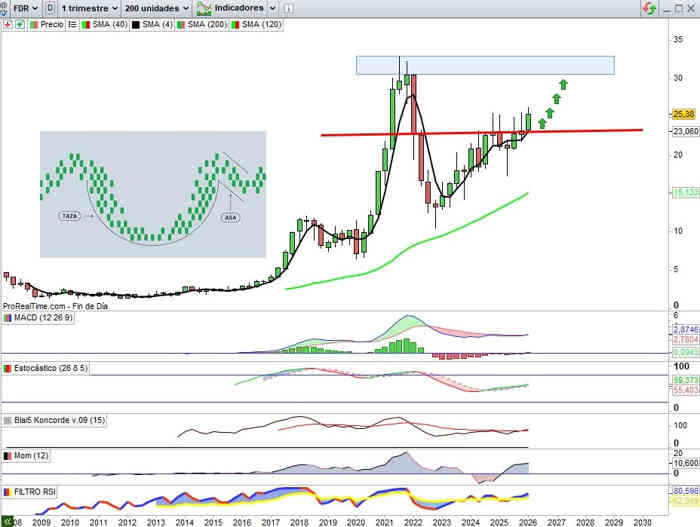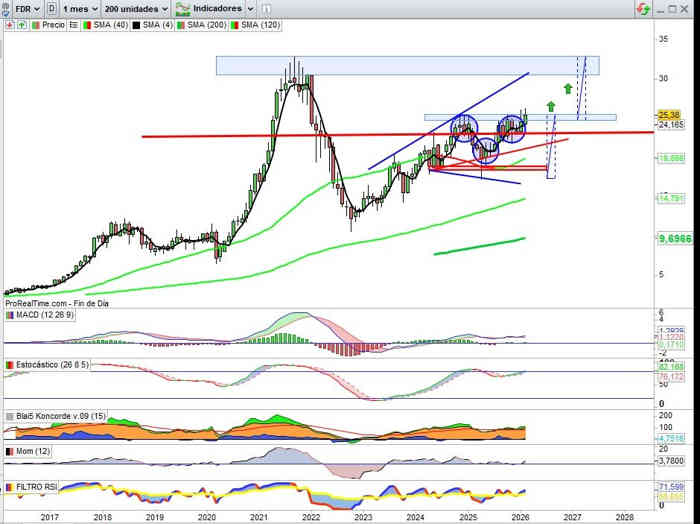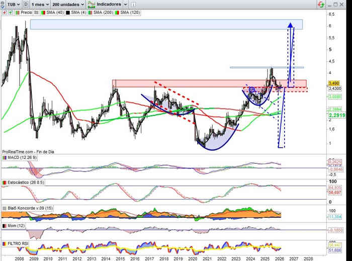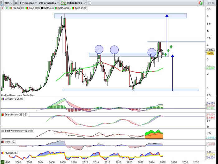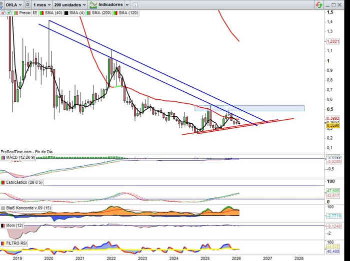 Sobre Gráfico Mensual, sin variación de momento a lo largo de este mes con respecto al cierre del mes anterior, y en clave dobles directrices soporte y resistencia, el amplio rango entre directrices bajistas como resistencia invita técnicamente a una prueba de estas resistencias para en perforación de la primera activar primeras señales claras de un posible cambio de tendencia de largo plazo, y el valor empieza a reunir credenciales sobre evolución de negocio para un paso adelante, el potencial del valor desde esta zona de apoyos es muy importante, y pienso que técnicamente la clave llegado el momento será el rango entre los 0,48€ y 0,54€ para esa señal cambio de tendencia, ¿será en este ejercicio 2026? Lo creo muy posible.