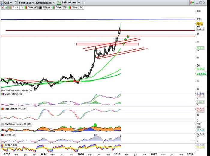 Y quizá lo más importante incluso sobre esa referencia de máximos históricos, esta semana nos mejora incluso la referencia soporte de protección ya de las amplias plusvalías que todavía retienen la rebajada posición en carteras actual, zona soporte ahora por los 96€. lo que el mercado nos pueda poner difícil, nosotros vamos a hacerlo fácil.