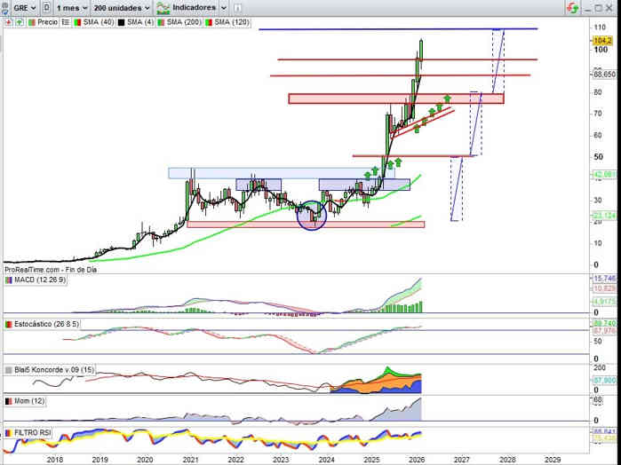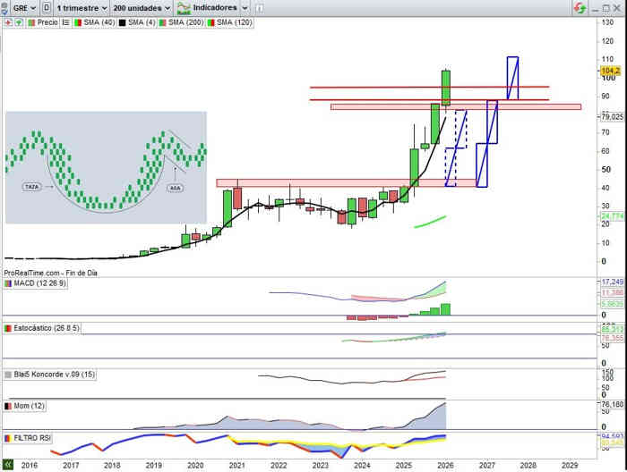 Sobre Gráfico Trimestral, con otra vista representativa de otra forma de Taza con Asa que ya vemos en que proyección desarrolla desde la zona de los 41€, está ya por encima de los 100€, para que tengamos presenta el potencial de los valores en los que ya la vamos señalando en estructural alcista de Manual, por ejemplo sobre SOLARIA o FLUIDRA, pero hay más, sobre esta misma temporalidad, de mayor calado o connotación alcista que se lo fuera sobre de menor plazo, en GRENERGY ahora con una revalorización a lo largo de este trimestre del 21,02%, alcanza ya la máxima de la estructura alcista nuevamente marcando nuevos máximos históricos en el camino hacia la cota en esta vista bajo mi punto de vista en sugerencia técnica hacia los 112€ por acción.