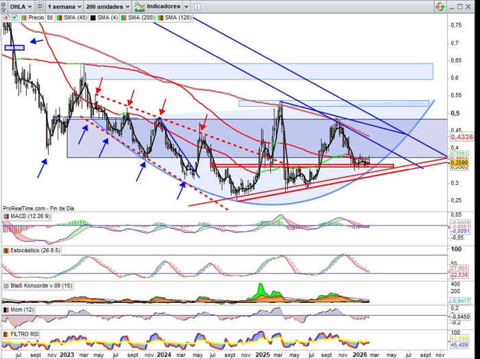 0,3590€, +1,13% esta semana. Que el valor refiere el soporte referencia en el rango entre los 0,3550€ y 0,3450€, aproximadamente, es muy dado a dejar velas con mechas de alta volatilidad muy características de control del valor, es evidente, en este rango en cierres se mueve desde finales del ejercicio 2025.