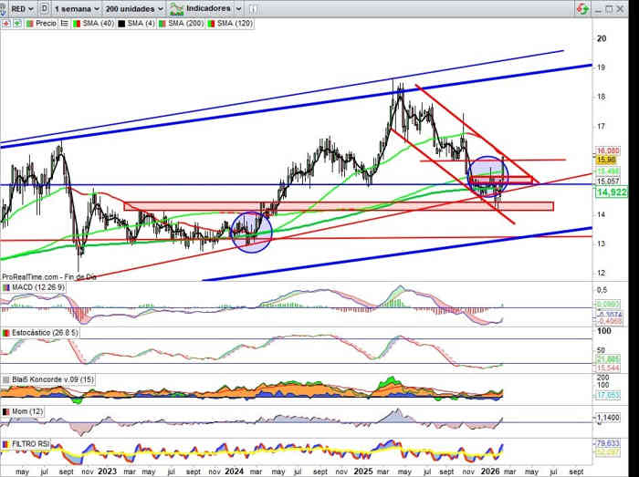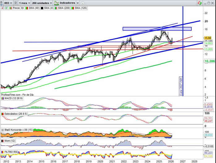 Sobre Gráfico Trimestral, mucho ruido sobre el valor y lo que esta dejando es una muy positiva estructura de apoyos en tendencia, aquí relevante la zona de los 15€ en cierres trimestrales, pero aunque falta mucho trimestre todavía empezamos a reflejar sobre esta importante vista trimestral que comento en muchos activos como determinante en actual situación mercado, como entre otros en el principal índice referencia mercados españoles, en REDEIA activa importante zona soporte sobre la doble directriz alcista que empieza a aportar solidez técnica a la tendencia del lado de los soportes.