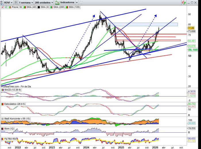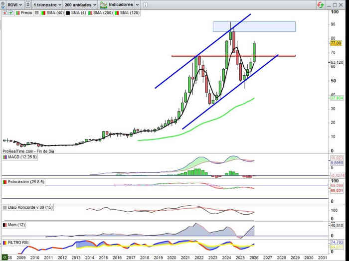 Sobre ROVI en particular, semana de continuidad de proyección alcista perforando resistencia clave esta semana, rompe directriz techo de Campo Expansivo que abre el valor a proyección en nuevas posibilidades de verticalidad al descartar la directriz resistencia perforada como referencia grado de esta verticalidad, y a partir de ahora como apoyo, la directriz puede ser clave en corto plazo para probar la siguiente resistencia clave ahora en el rango entre los 78€ y 82€ ya reflejada en anteriores análisis.