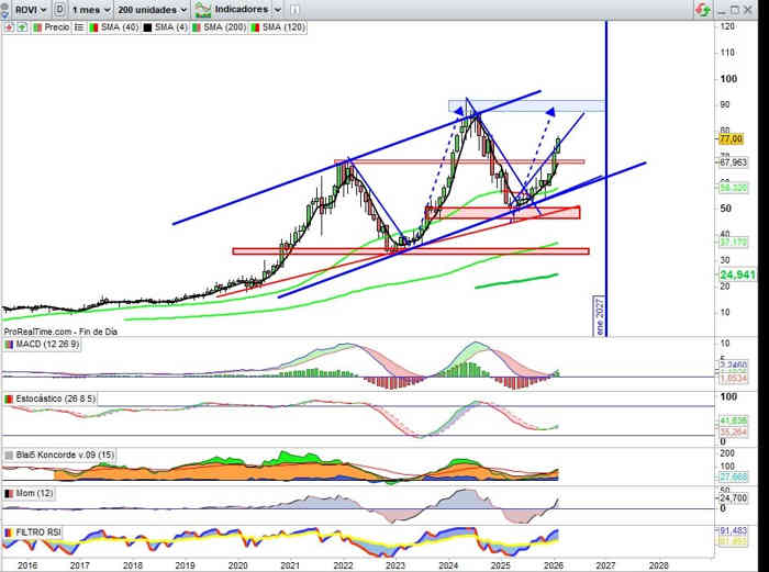 Proyección activada hacia la zona entre los 85€ y 92€, y siguiendo el Canal de momento en sugerencia técnica para meter dinero aquí pensando en que a partir de la zona de los 85€ en cierres de Trimestre activaría señal de SUBIDA LIBRE hacia nuevos máximos históricos, a pesar de que los actuales están referenciados a los 92€ a día de hoy.