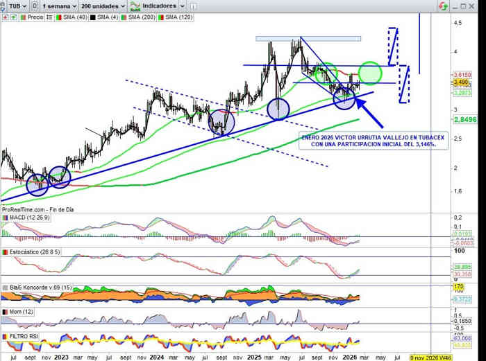3,49€, +0,72% esta semana. Paso a paso, el cierre de esta semana deja el valor asomando ya por encima de la referencia resistencia comentada clave inmediata que aportaría en confirmación por encima de los 3,47€ una nueva señal de apoyo o soporte de proyección estructural relevante, pero hay que confirmarla, en actuales credenciales técnico y fundamentales, sugerencia técnica que no tendría problema, y el más manipulativo en este valor en actual estructura alcista bajo mi punto de vista ya ha pasado, sobre los movimientos en el accionariado que ya hemos ido confirmando, tardaron, pero se hizo todo de manera muy técnica, y esto ahora lo refleja el mercado activando como vemos ya en relanzamiento alcista en tendencia importante Capital Inversor y movimientos en el accionariado muy esperados.