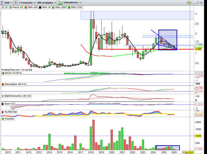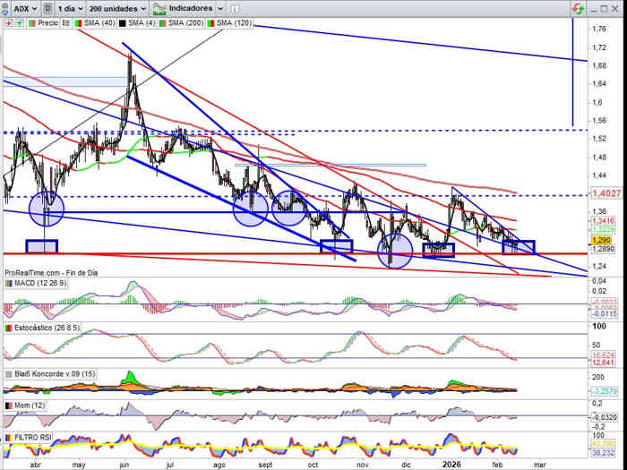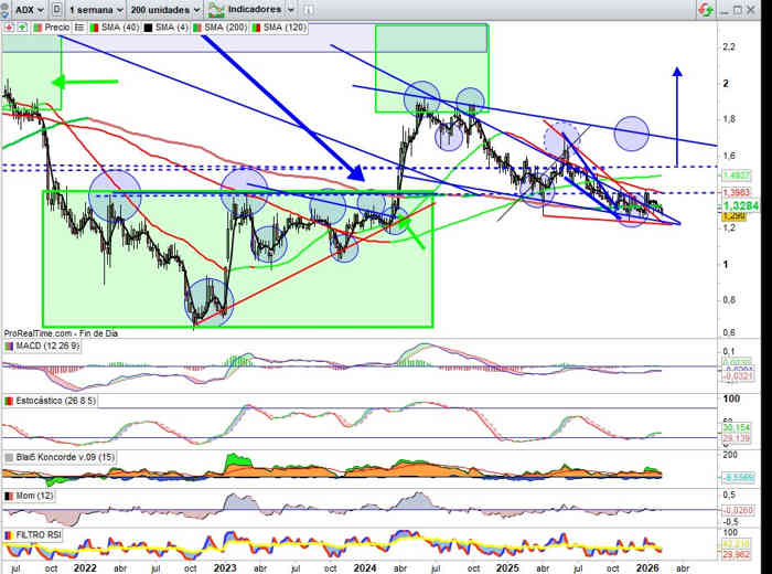 En Medio plazo Cuádruple Suelo, mínimo en Abril de 2025 en la zona de los 1,27€. Desde Principios de ejercicio actual desarrollo de Cuña de implicaciones alcistas desde la zona de los 1,40€, clave resistencia ahora por arriba.