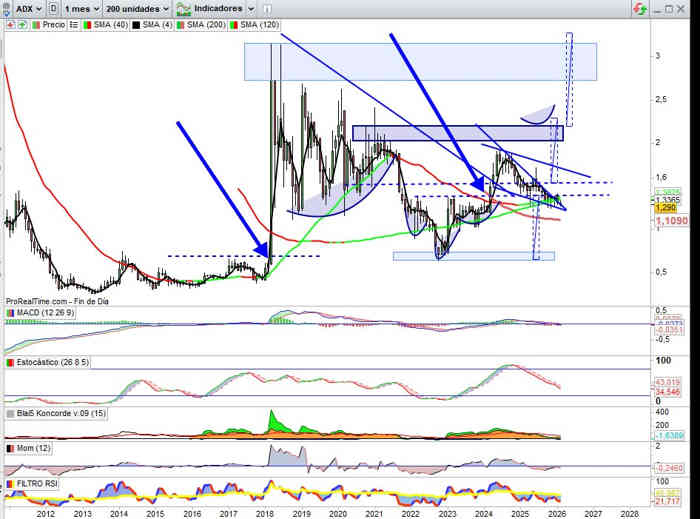 Clave por arriba la zona de los 1,40€, y por abajo en esta vista sería importante este mes no perder la zona de los 1,27€ y si presenciamos una barrida precursora de relanzamiento alcista, que la referencia de los 1,24 sirva para tal fin, los apoyos en esta zona serían importantes, y en cierres por encima buena señal próximas semanas si ocurre la barrida.