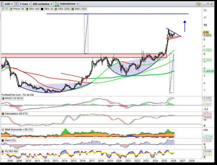 Indicadores en señal de compra y en favor de la tendencia, que el valor alcanza en el cierre de esta semana nuevo máximo de la estructura en cierre de cuerpo de vela, y en la referencia de la mecha en sus máximos se quedó a las puertas, la semana que viene si no hay nada extraño podríamos ver esos nuevos máximos de la estructura en este sentido. El soporte aquí referenciado a la zona de los 5,10€ en primer término.