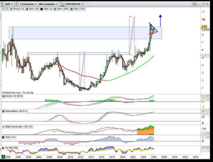 Sobre Gráfico Trimestral, vamos a ver si en actuales credenciales técnico y fundamentales quiere romper ya o necesita más tiempo, de momento ante la resistencia clave del Banderín, y queda trimestre por delante, activo en señal de SUBIDA LIBRE, aquí para proyección técnica hacia la cota de los 10,45€ como resistencia, pero sobre lo ya comentado sobre tesis de inversión en el valor, bajo mi punto de vista valor con mucho más potencial que el reflejado técnico en estas vistas gráficas, si se confirma que iremos actualizando.
