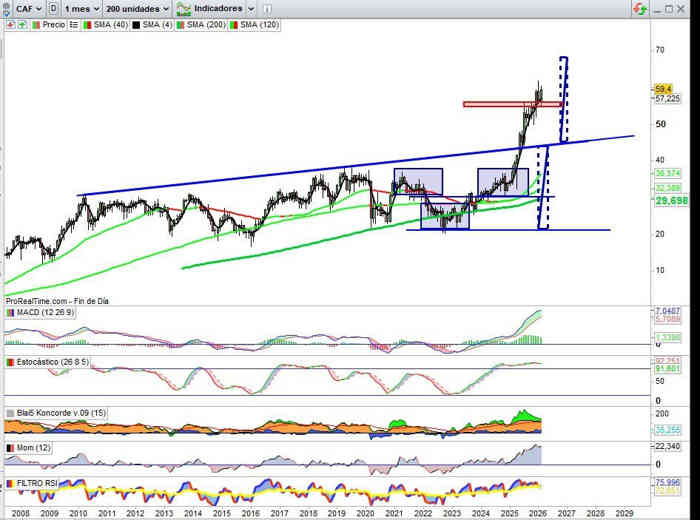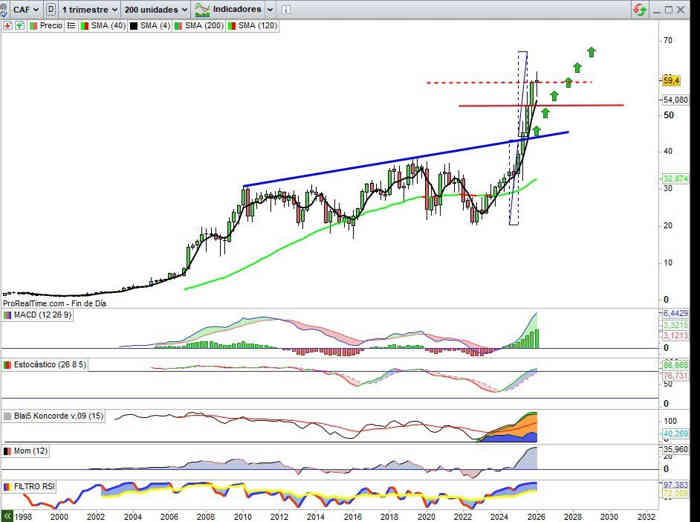 Indicadores en señal de compra y en favor de la tendencia para proyectarse a nuevos máximos históricos progresivos de momento mientras la referencia soporte clave inmediata mantenga el precio por encima de la zona entre los 56€ y 55€.
