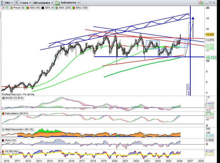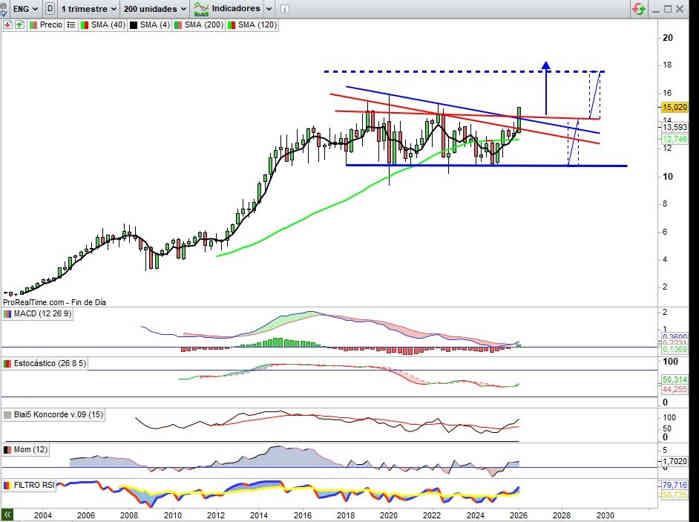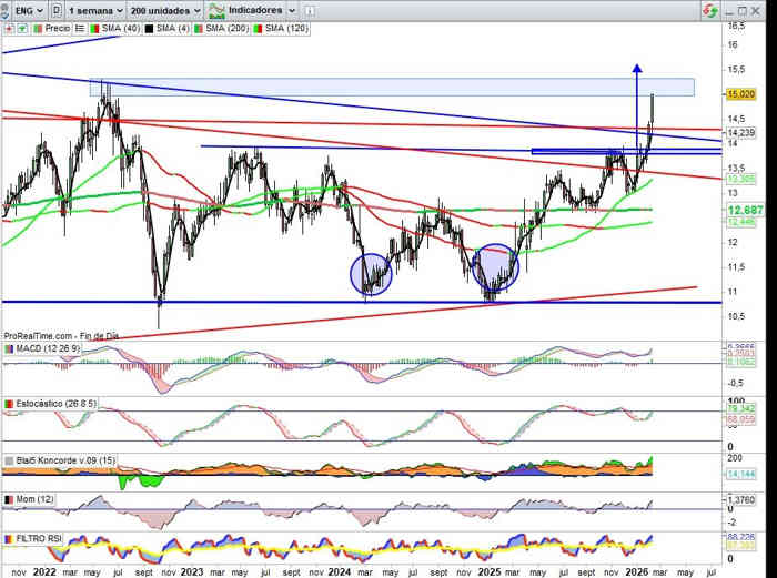 Sobre Gráfico Semanal, la rotura de resistencia la semana pasada ya reflejaba fuerza compradora, esta semana la confirma, y alcanza ya la zona resistencia clave de la proyección, bajo mi punto de vista en actuales indicadores, señal de compra y en favor de la tendencia, no hace falta mucha más palabra, menos técnica, muy buen activo pensando en estructura y tendencia actual que con un poco más activa señal SUBIDA LIBRE, para ello, es clave el rango entre los 15€ y 15,35€, pero para reflejar nuevos máximos históricos, necesarios cierres semanales por encima de los 15,90€.