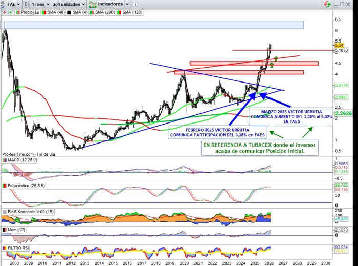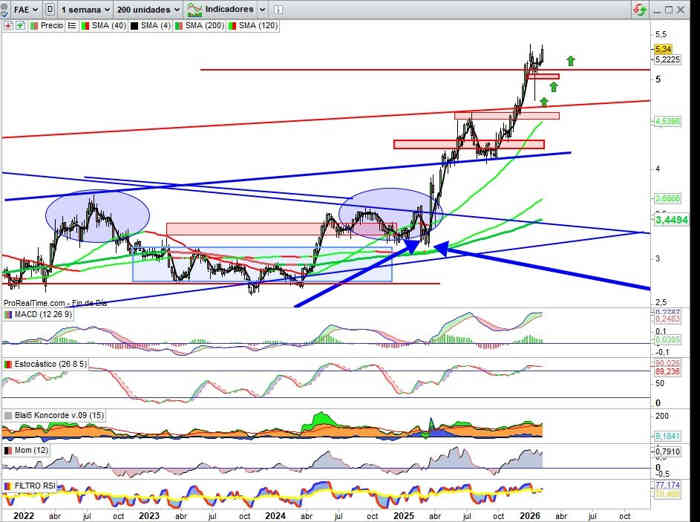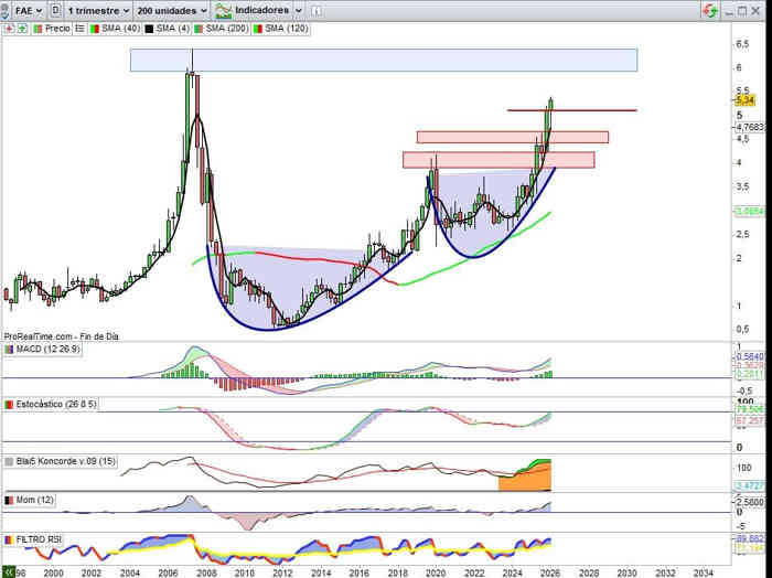 Indicadores en señal de compra y en favor de la tendencia, otro activo de menor capitalización que mantiene credenciales técnicas que lo referenciado en escenario IBEX35, fuera de este, otro activo por tanto a tener en cuenta. La proyección estructural aquí con objetivos abiertos hacia la zona en el rango entre los 6,10€ y 6,45€.