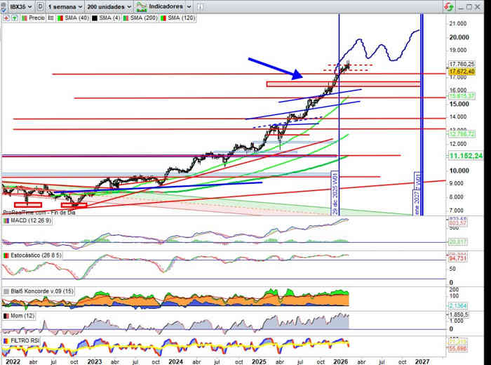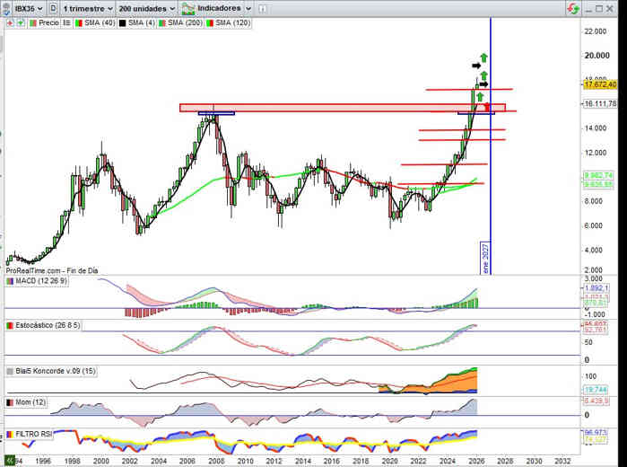 Sobre Gráfico Semanal, de momento en lo que llevamos de ejercicio 2026 se mantiene la tendencia alcista, con el selectivo español marcando nuevos máximos históricos progresivos, nuevos actualmente en la zona de los 18.270 Puntos.