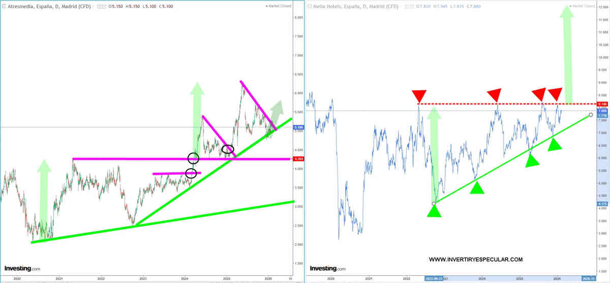 Y la otra MELIA HOTELS (MEL:MC) clara resistencia en la zona de niveles precovid que ni de lejos eran sus máximos históricos en aquel momento y por abajo mínimos obedeciendo una directriz alcista conformando una figura triangular de un objetivo 12 pero claro no para el corto plazo.