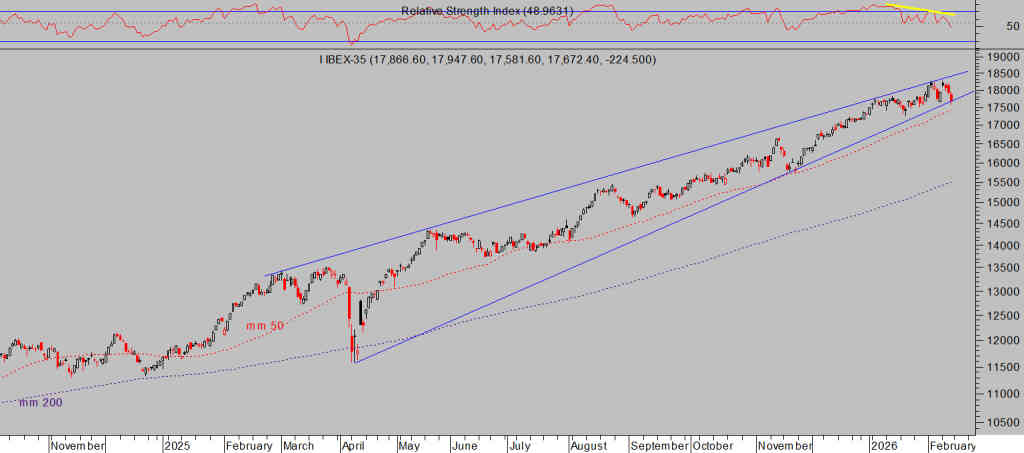 La sincronización en el comportamiento de los mercados globales también opera cuando las bolsas corrigen, la semana pasada se produjeron ventas de acciones europeas y los índices también corrigieron. Las pautas técnicas de las bolsas USA y UE son similares y las implicaciones iguales, cabe esperar que los desenlaces, al menos de más corto plazo sean también similares.